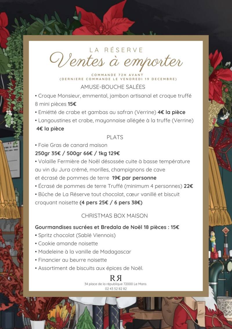 La Réserve est un Bistrot Gourmand situé en plein centre ville du Mans, offrant une cuisine raffinée et créative dans un cadre élégant et chaleureux. Notre équipe passionnée vous promet une expérience culinaire inoubliable, où chaque plat est préparé avec soin et attention aux détails.